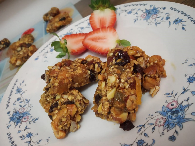 Um dos principais ingredientes da receita é a aveia. Esse cereal possui uma fibra solúvel chamada beta-glucana. Sabe-se que o consumo regular desta fibra ajuda a diminuir o colesterol e auxilia no controle da pressão arterial. Juntamente com a aveia, nessa receita temos linhaça dourada, uma fonte dos ácidos graxos ômega 3 e 6, ótimos aliados no combate a doenças cardiovasculares. Aliado a essas poderosas fibras, essa opção saudável de barrinha ainda conta com inúmeros benefícios das oleaginosas, como avelãs, castanhas, amêndoas e o melado de cana – rico em ferro, potássio, magnésio, selênio e vitamina B. Tudo deve ser usado com equilíbrio, para que se possa ter os melhores benefícios de forma saudável e nutritiva.