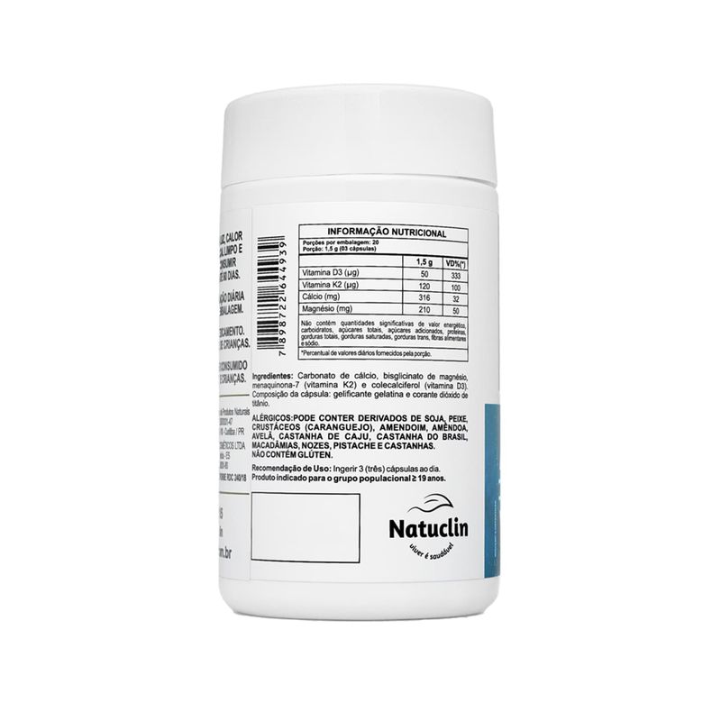 Ingredientes: Carbonato de cálcio, bisglicinato de magnésio, menaquinona-7 (vitamina K2) e colecalciferol (vitamina D3). Composição da cápsula: gelificante gelatina e corante dióxido de titânio.